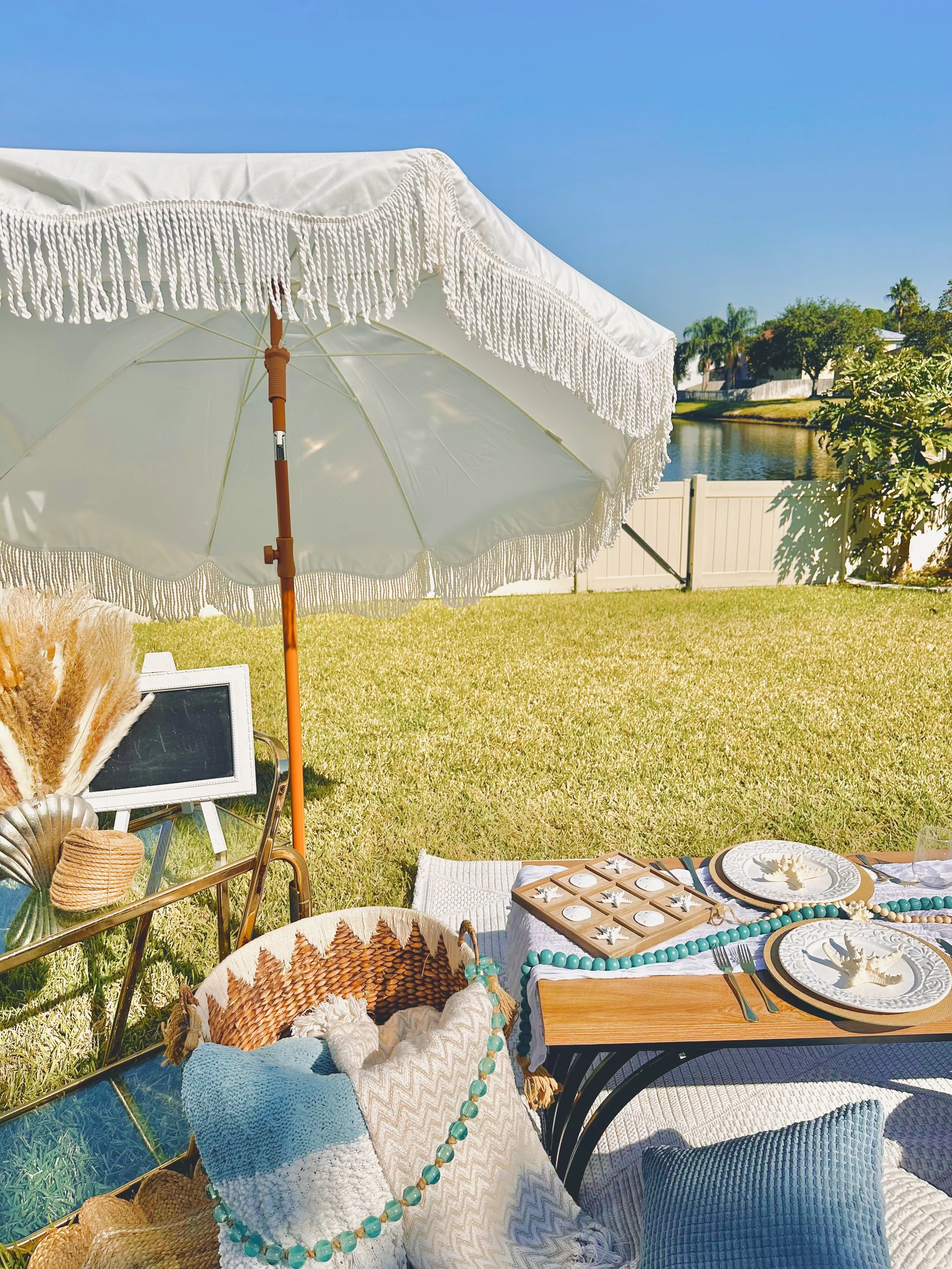 Add effortless elegance and charm to those sun-kissed days with our Luxe Umbrella upgrade. Featuring soft, flowing fringe, this stylish umbrella brings both shade and sophistication to your setup.